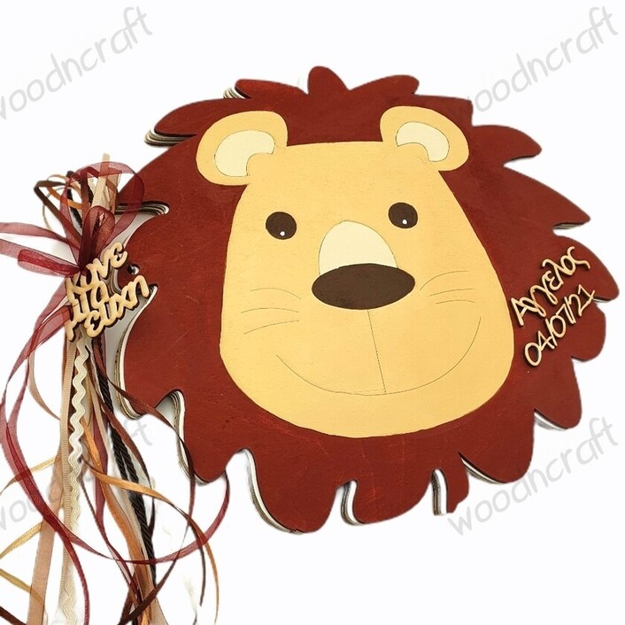 Χειροποίητο ξύλινο βιβλίο ευχών σε σχέδιο κεφάλι λιονταριού! Αν ετοιμάζετε βάφτιση σε ανάλογο θέμα, είναι η ιδανική επιλογή.. Διακοσμείται με κορδελάκια στις αποχρώσεις που θα διαλέξετε, με το ξύλινο στοιχείο "κάνε μια ευχή" και προαιρετικά με το όνομα και την ημερομηνία της επιλογής σας!