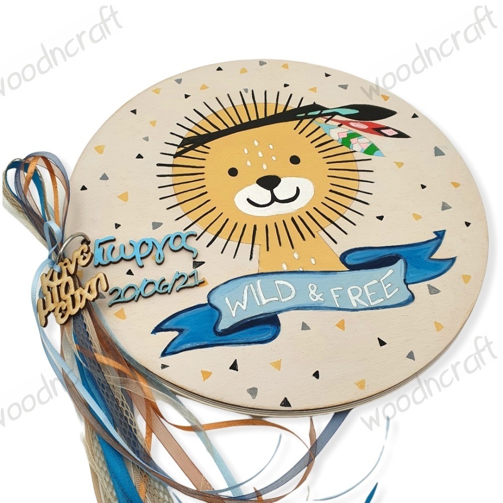 Χειροποίητο ξύλινο βιβλίο ευχών σε στρόγγυλο σχήμα με σχεδιασμένο ένα γραμμικό boho λιονταράκι με μπανεράκι wild and free! Αν ετοιμάζετε βάφτιση σε ανάλογο θέμα, είναι η ιδανική επιλογή.. Διαλέγετε το χρώμα που ταιριάζει με τον στολισμό σας, καθώς και τα κορδελάκια της διακόσμησης που θα συνοδέψουν το ξύλινο στοιχείο "κάνε μια ευχή" και προαιρετικά το όνομα και την ημερομηνία της επιλογής σας!