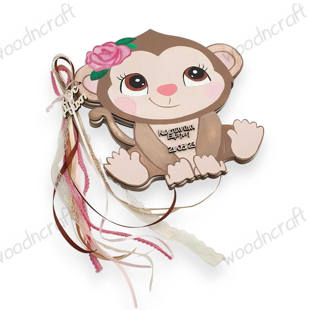 Χειροποίητο ξύλινο βιβλίο ευχών σε σχέδιο μαϊμουδίτσα με τριαντάφυλλο στο κεφάλι! Αν ετοιμάζετε βάφτιση ή παιδικό πάρτι γενεθλίων με θέμα τα ζωάκια της ζούγκλας είναι η ιδανική επιλογή. Προσαρμόζεται στα χρώματα της επιλογής σας και διακοσμείται με ανάλογα κορδελάκια. Πάνω στο ευχολόγιο μπορούμε να τοποθετήσουμε το όνομα του παιδιού καθώς και την ημερομηνία της βάφτισης ή των γενεθλίων του!