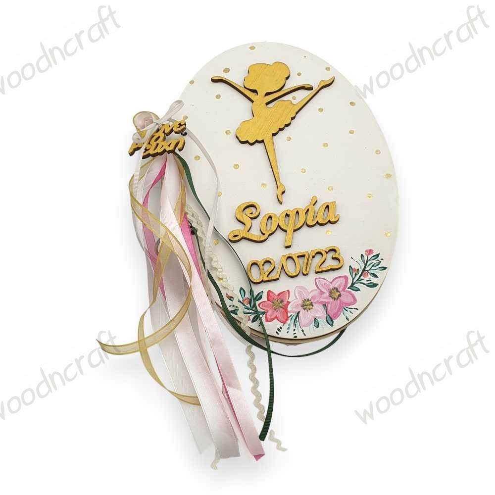 Δημιουργημένο σε ελκυστική οβάλ μορφή, το βιβλίο περιλαμβάνει λουλούδια που εντυπωσιάζουν. Το όνομα και η ημερομηνία της επιλογής σας χαρακτηρίζονται σε ξύλινα στοιχεία και μπορούν να προστεθούν στα χρώματα της επιλογής σας, καθιστώντας το ιδανικό για τη βάφτιση της μικρής σας μπαλαρίνας ή για ένα πάρτυ γενεθλίων με θέμα το μπαλέτο.