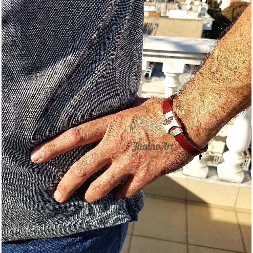 Πρωτότυπο χειροποίητο ανδρικό βραχιόλι με πλακέ δέρμα 10mm. σε χρώμα μπορντό διακοσμημένο με μεταλλικά στοιχεία από χυτό μέταλλο zamak, μεταλλικές άκρες και κούμπωμα με δέσιμο μακραμέ που αυξομειώνεται!